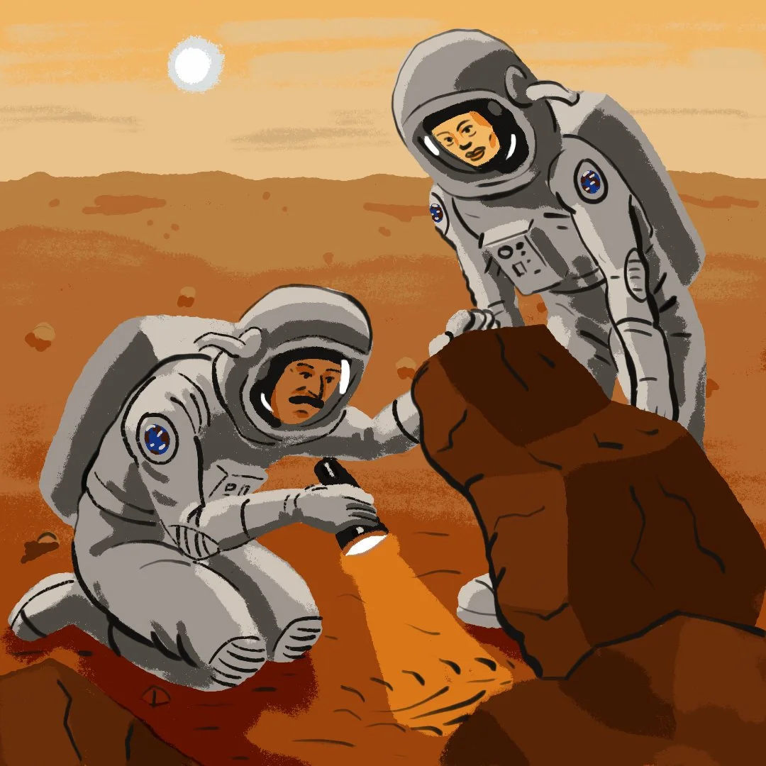 The second image is of scientists looking under Martian rocks for traces of microbial life.