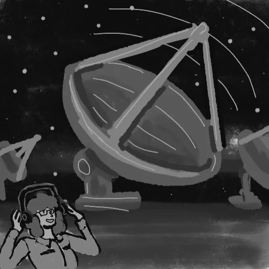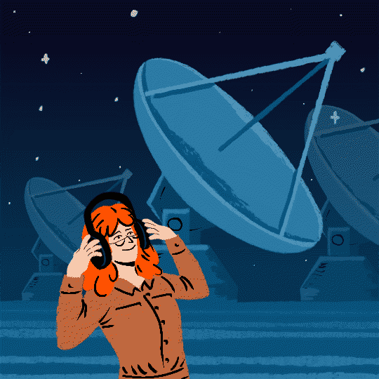 The first image was inspired by iconic scenes from the film Contact and the book The Three-Body Problem, as a scientist listens to signals from a radio telescope that is scanning exoplanets.